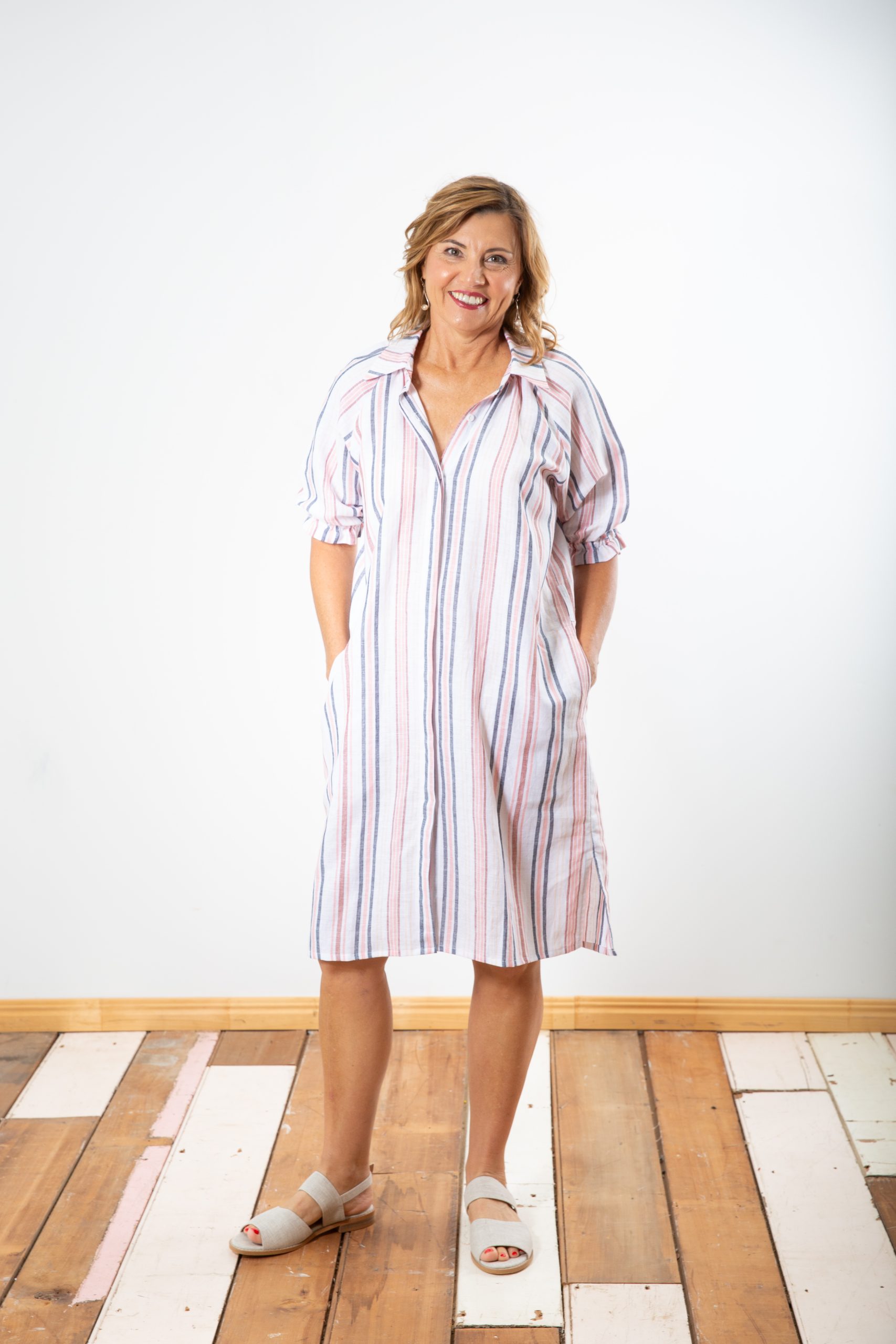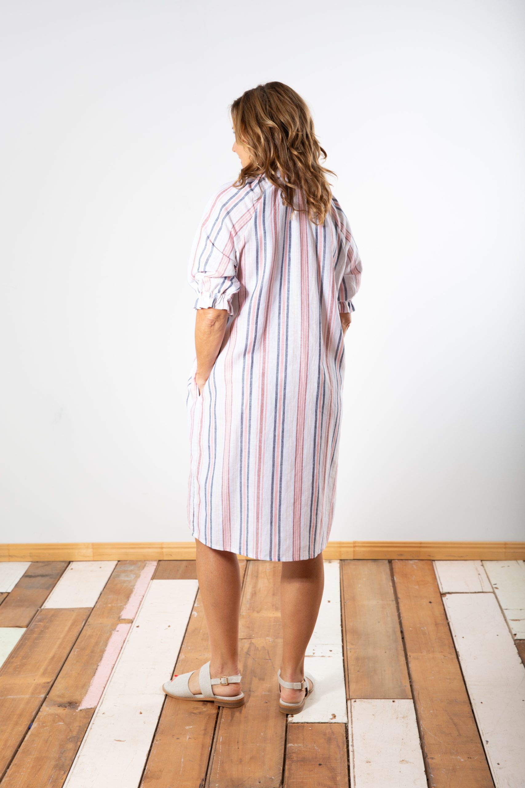 Timeless stripes meet breathable comfort in this stylish dress, crafted from a lightweight 70% linen and 30% cotton blend. Perfect for warm weather, the fabric offers a naturally soft, airy feel with a flattering drape. Choose from three beautiful color combinations to suit your style: