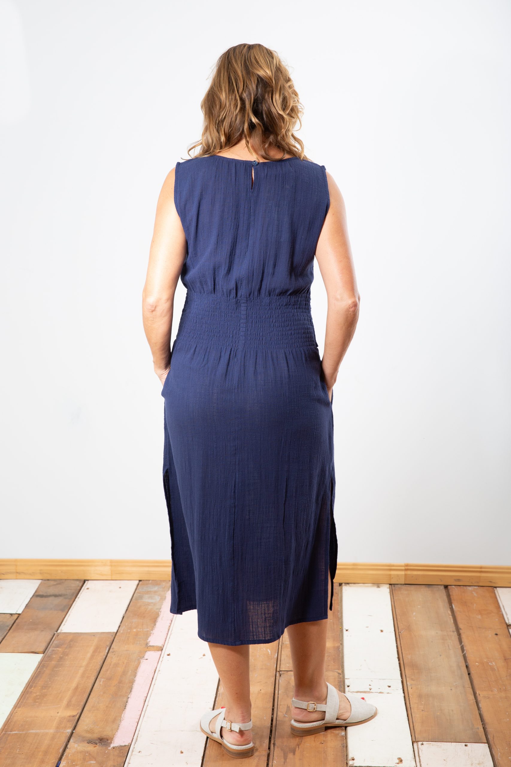 A timeless summer essential, this sleeveless midi dress is made from 100% cotton for breathable, all-day comfort. Featuring a flattering smocked waist, soft gathered skirt, and side splits for ease of movement. The back keyhole button detail adds a subtle, stylish touch.